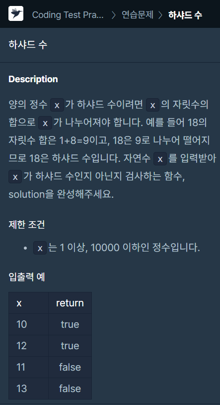 - ์ ๋ ฅํ x๋ฅผ ์๋ฆฟ์์ ํฉ์ผ๋ก ๋๋์์ ๋ ๋๋จธ์ง๊ฐ 0์ด๋ฉด ์ฐธ ์๋๋ฉด ๊ฑฐ์ง